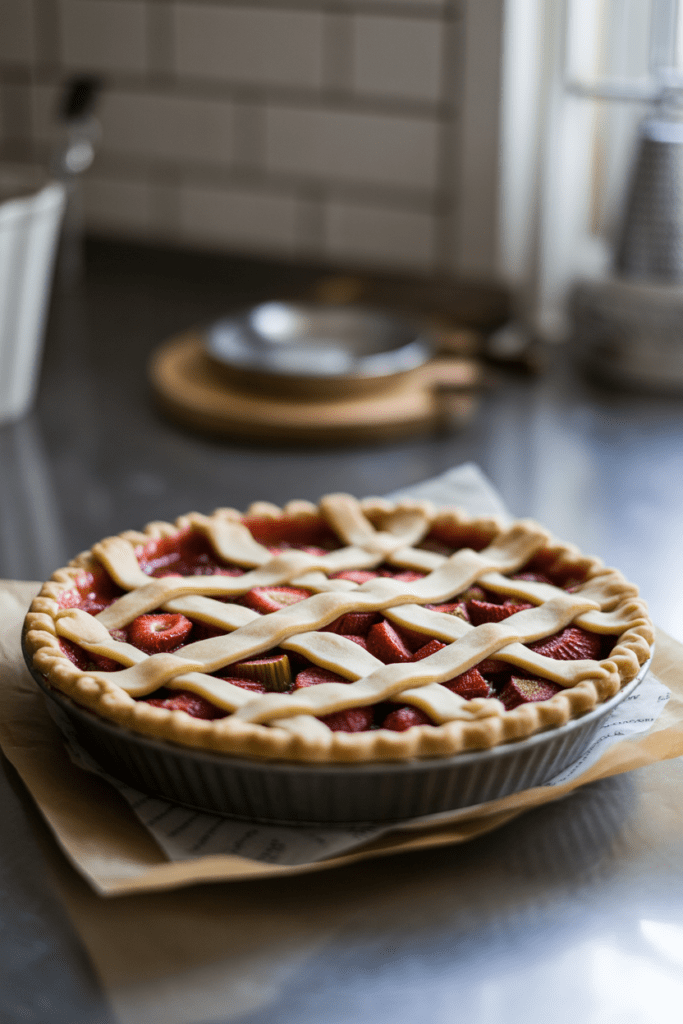 As it bakes, the kitchen fills with a sweet, tangy aroma — bright strawberries bubbling together with rhubarb, wrapped in a buttery crust that slowly turns golden in the oven. It’s the kind of smell that makes you peek through the oven door more than once, just to watch the filling thicken and the edges crisp.