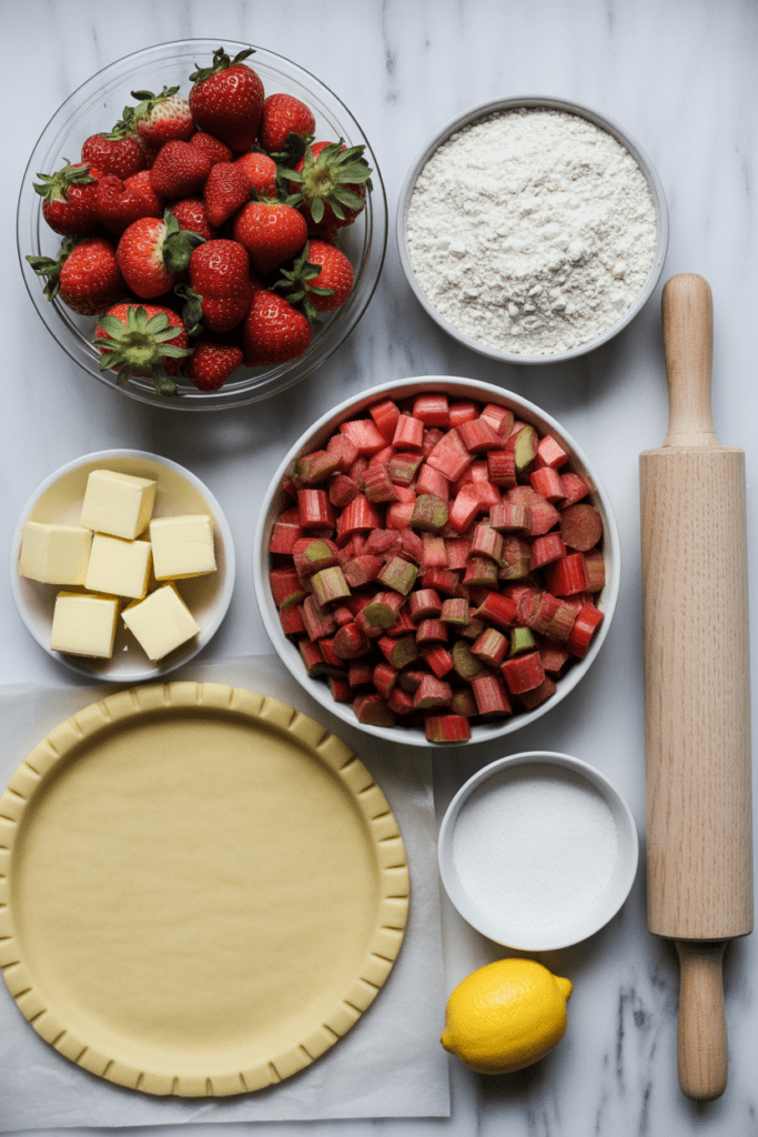 Fresh rhubarb gives the best texture and color. The lemon juice brightens the filling without making it sour, while a mix of sugars adds depth instead of flat sweetness.