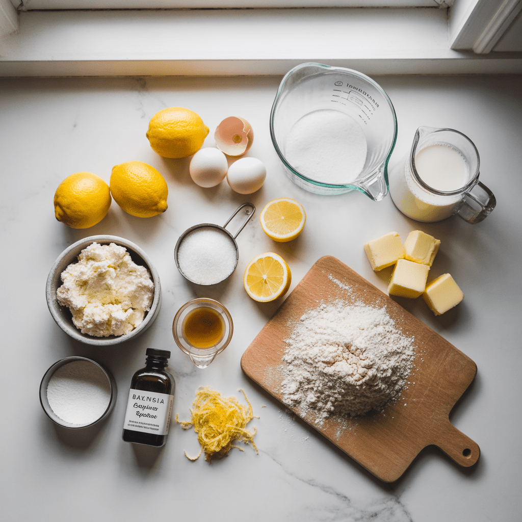 - In a separate bowl, mix ricotta, sugar, melted butter, eggs, lemon zest, lemon juice, and vanilla until smooth.